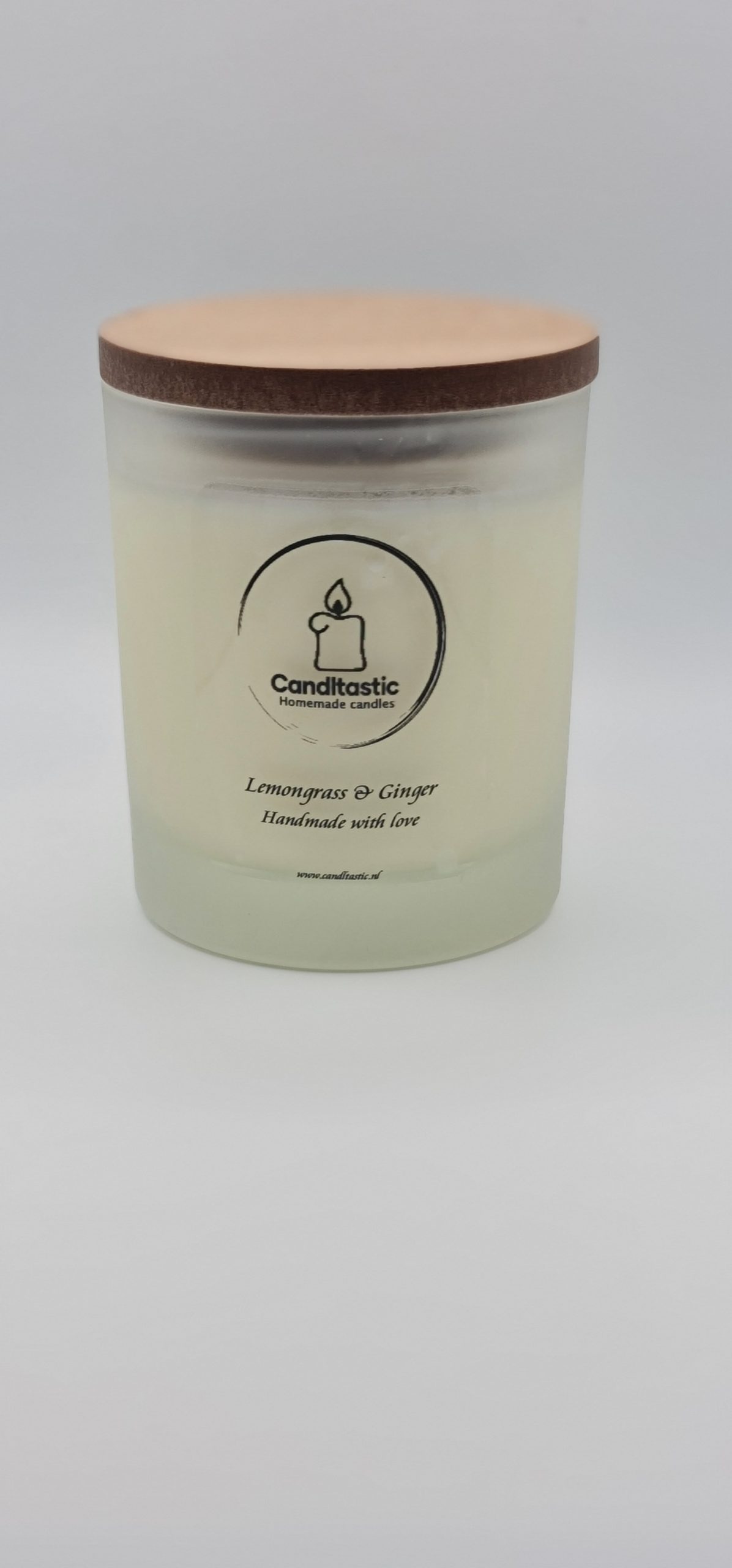 We gebruiken een ecologische soja wax die hand gegoten is in een frosted glas met een mooi houten dekseltje.
