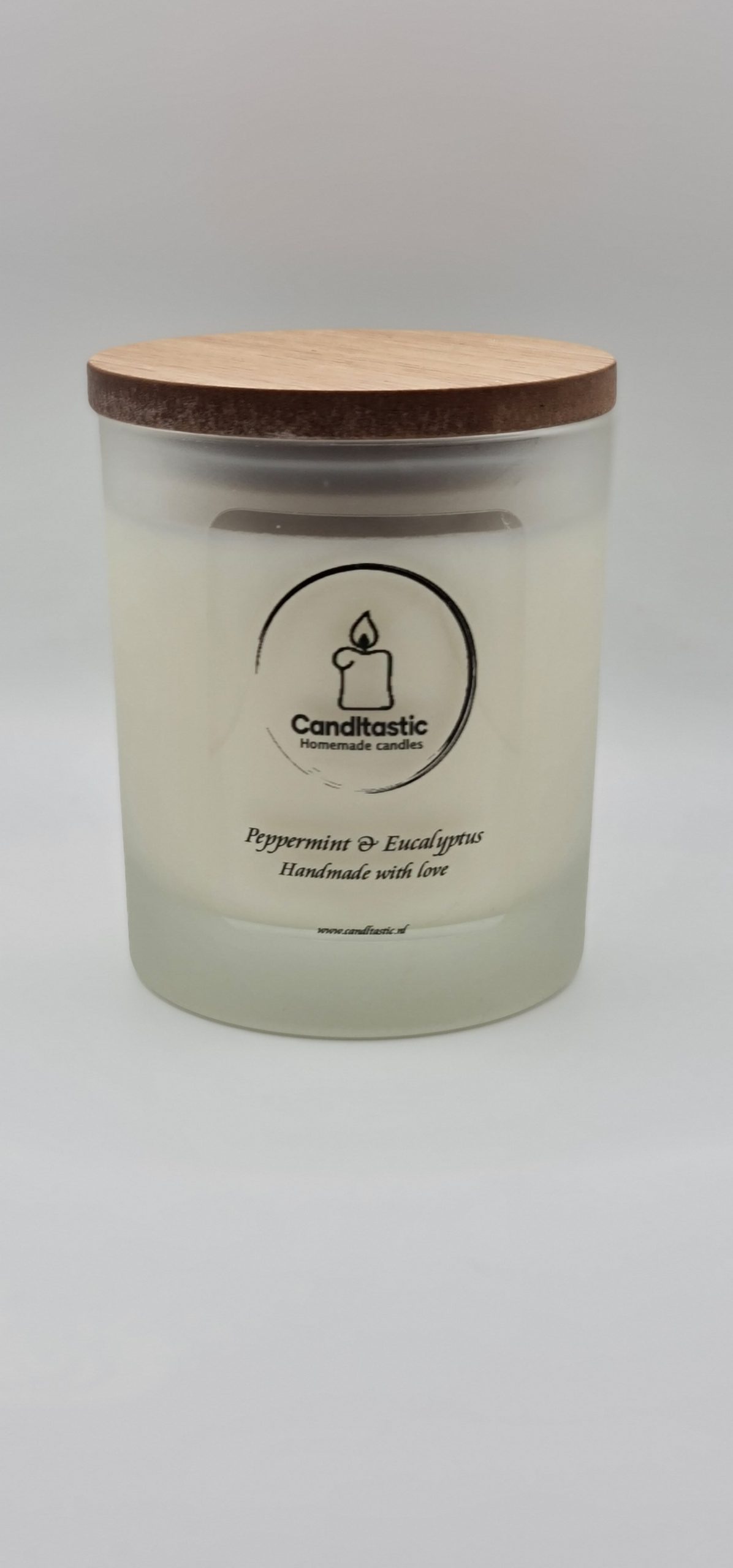 Deze blend in een ecologische soja wax is hand gegoten in een frosted glas met een mooi houten dekseltje.